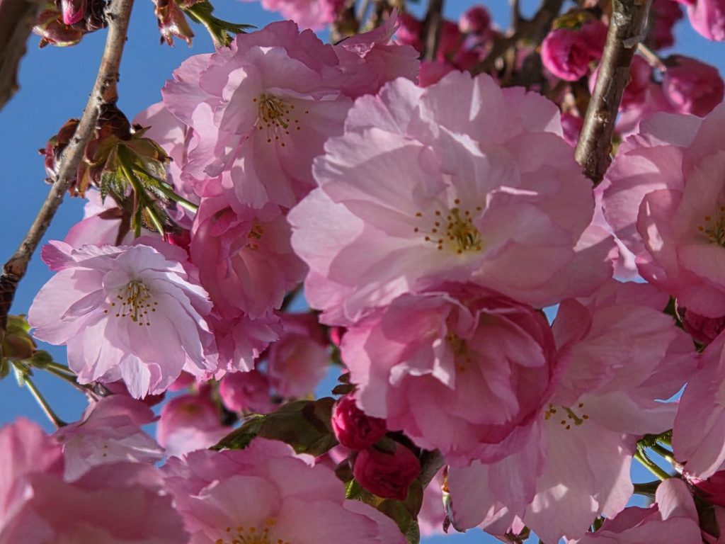 街並みの桜も遅咲きの八重のサトザクラや色濃いピンクの陽光桜が